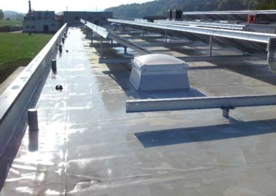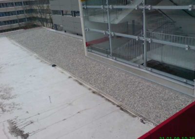 Ausführung: ca. 450 qm Bürodach-, Hallendach- und Balkonabdichtung, Abdichtungsbahn Sika 15 G, Terrassenlager ZinCo Elefeet, Balkonrinne ZinCo Systemrinne